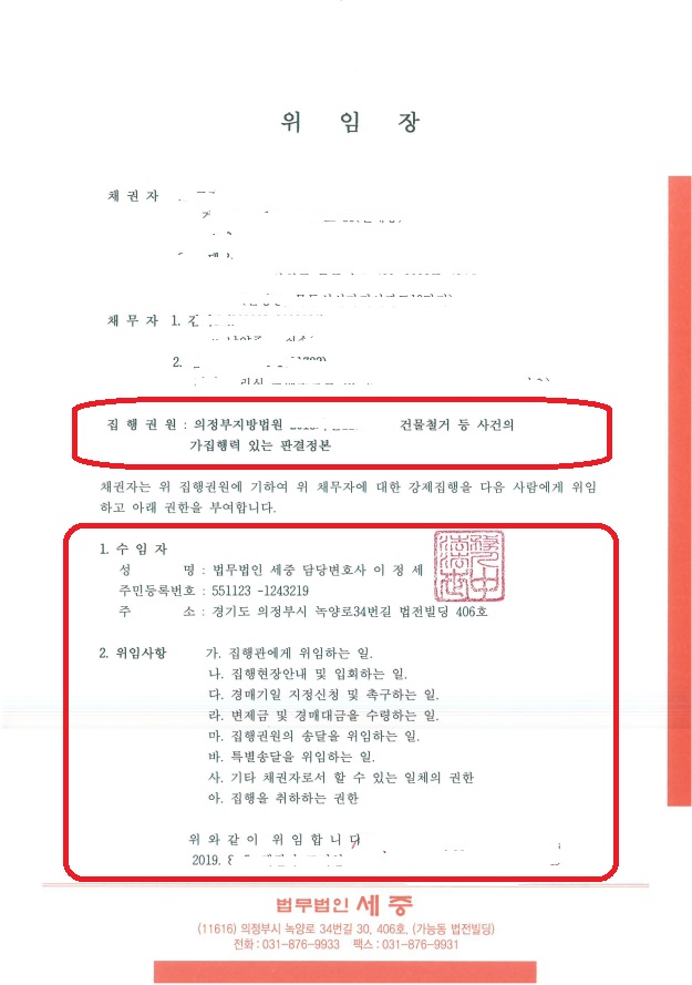 건물철거 인도집행 위임장(대리인 법무법인 세중) 페이지 정보 작성자 (14.♡.133.23) 작성일20-04-29 17:23 조회3,998회 댓글0건 관련링크 이전글 다음글 목록 본문 임대인 스스로 건물철거 및 토지인도 소송을 제기하여 판결을 받은 후본 법무법인에 건물철거 및 토지인도 강제집행 사건을 의뢰한 사례집행신청시 첨부하는 본 법무법인의 강제집행 위임장 댓글목록 등록된 댓글이 없습니다. 이전글 다음글 목록